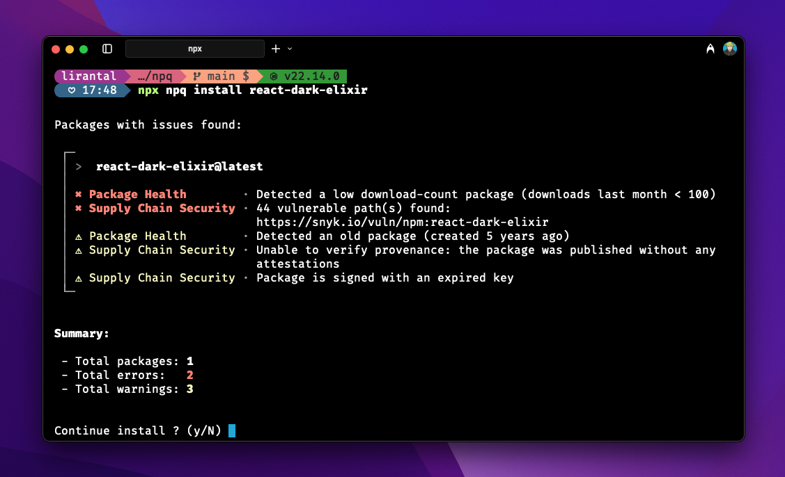 npm installwill install a module even if it has vulnerabilities; NPQ will display the issues detected, and prompt the user for confirmation on whether to proceed installing it. - NPQ will run synthetic checks, called marshalls, on the characteristics of a module, such as whether the module you are going to install has a